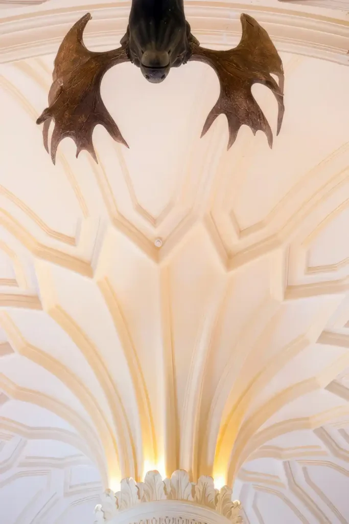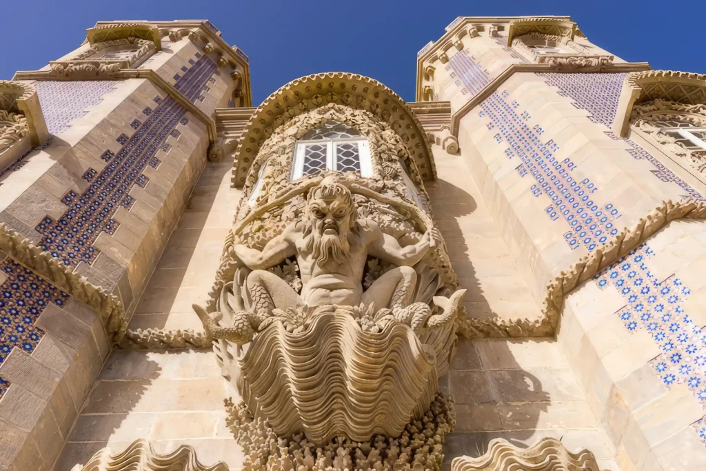 Wir gingen trotzdem hinein und waren fast erleichtert, den Busladungen voller Touristen entkommen zu sein. Der Eingang führt durch das Tritonstor, das selbstverständlich von einer riesigen Kreatur geschmückt wird, halb Mensch, halb Fisch. Leider wird es im Inneren deutlich weniger seltsam. Die Innenräume wirken, als seien sie von jemandem gestaltet worden, der fest auf dem Boden der Tatsachen stand, und entsprechen ziemlich genau dem, was man von einem klassischen Palast erwartet: Salons, Arbeitszimmer, Kapellen sowie prunkvolle Stilmöbel und Kunstwerke.