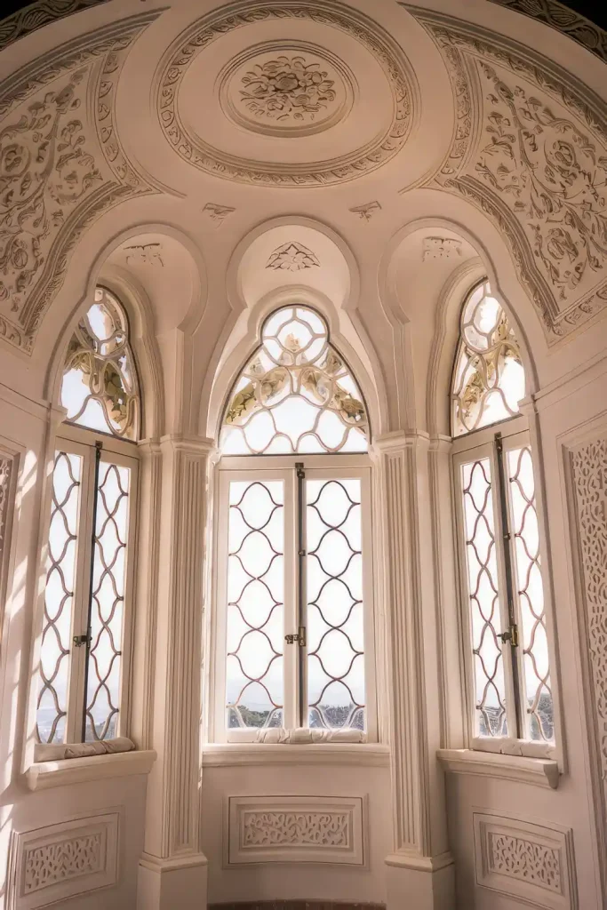 Es ist absurd, aber zugleich beeindruckend. Der „Neue Palast“ von Dom Fernando II., dem sogenannten Künstlerkönig, wurde ab 1842 errichtet. Zuvor stand an dieser privilegierten Stelle auf dem Berggipfel ein Hieronymitenkloster. Nachdem religiöse Orden 1834 verboten worden waren, handelte der König schnell und sicherte sich das Gelände. Rund 15 Jahre dauerte der Bau des Schlosses, das seitdem wie eine kühne Krone über der Skyline von Sintra thront.